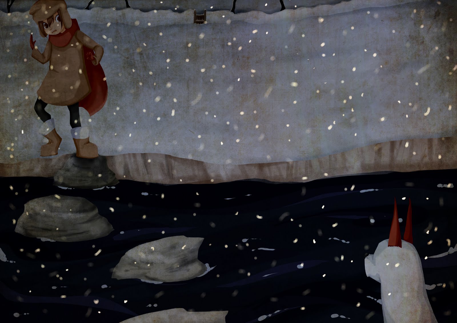 Another concept based on an earlier sketch. Here the girl is beginning to cautiously cross the river. In my film I want the river to be an improtant part, because once she passes the river, she cannot turn back. She hesitated at first, and considered returning to the graveyard, but soon decided that she did not want to be alone and would prefer the company of the dog. It is the first step to her moving on and accepting her death, and the point of no return. I think that the river scene is important because of this, and also because of how rivers are used in mythology as a crossover onto the land of the dead, e.g. the river Styx